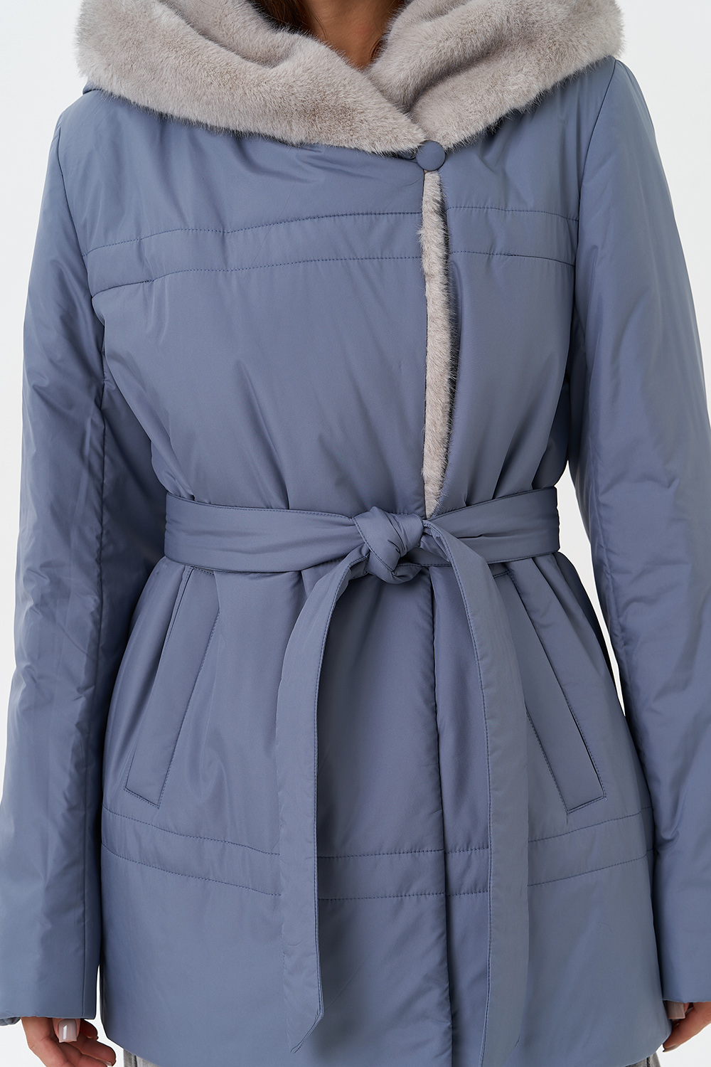 Крой воротника - капюшон, отделка эко мех под норку