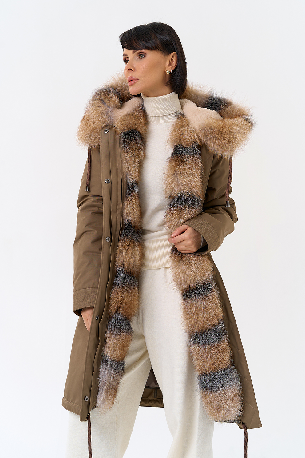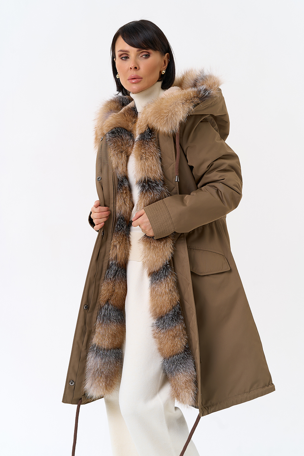 Крой воротника - капюшон, отделка лиса Otoban, овчина